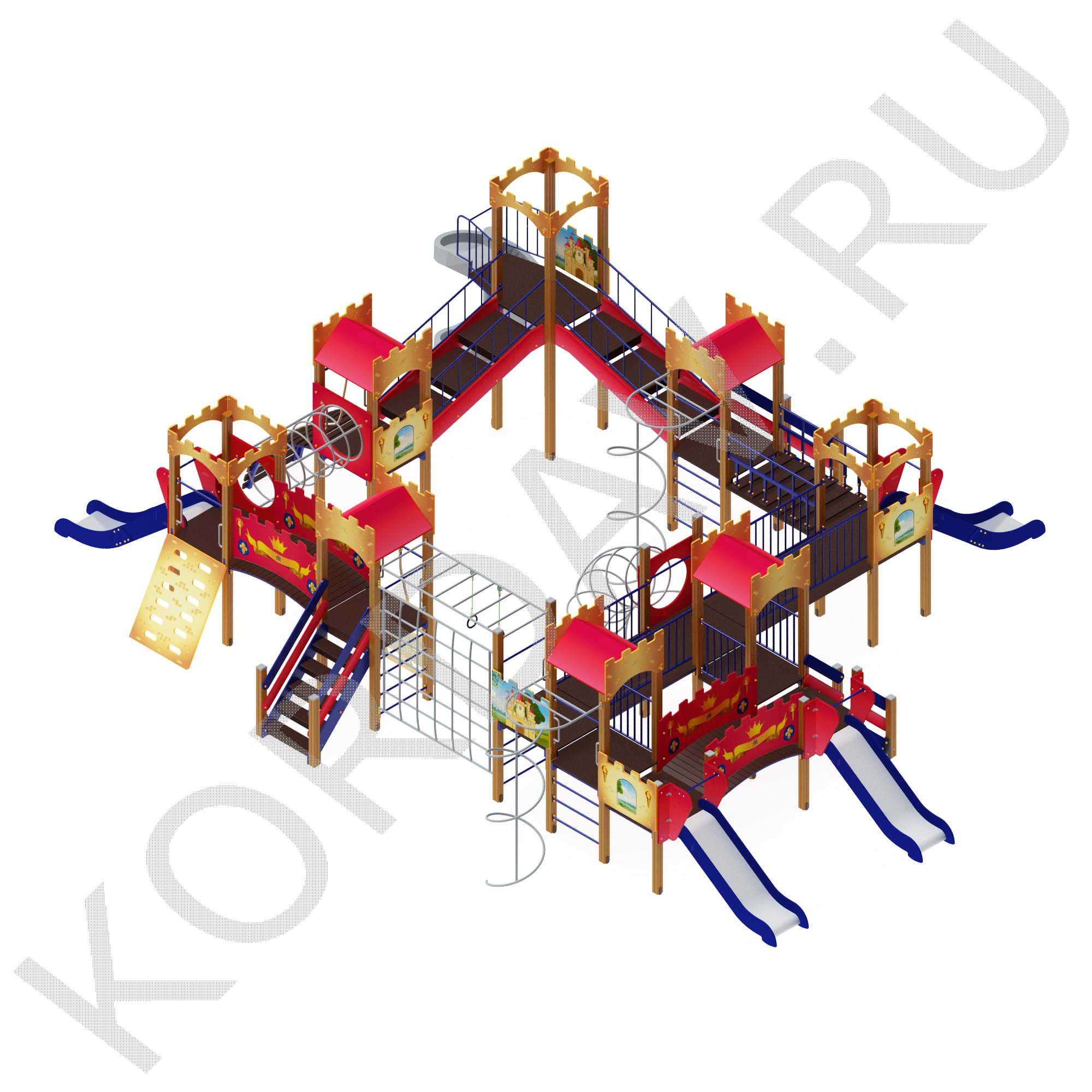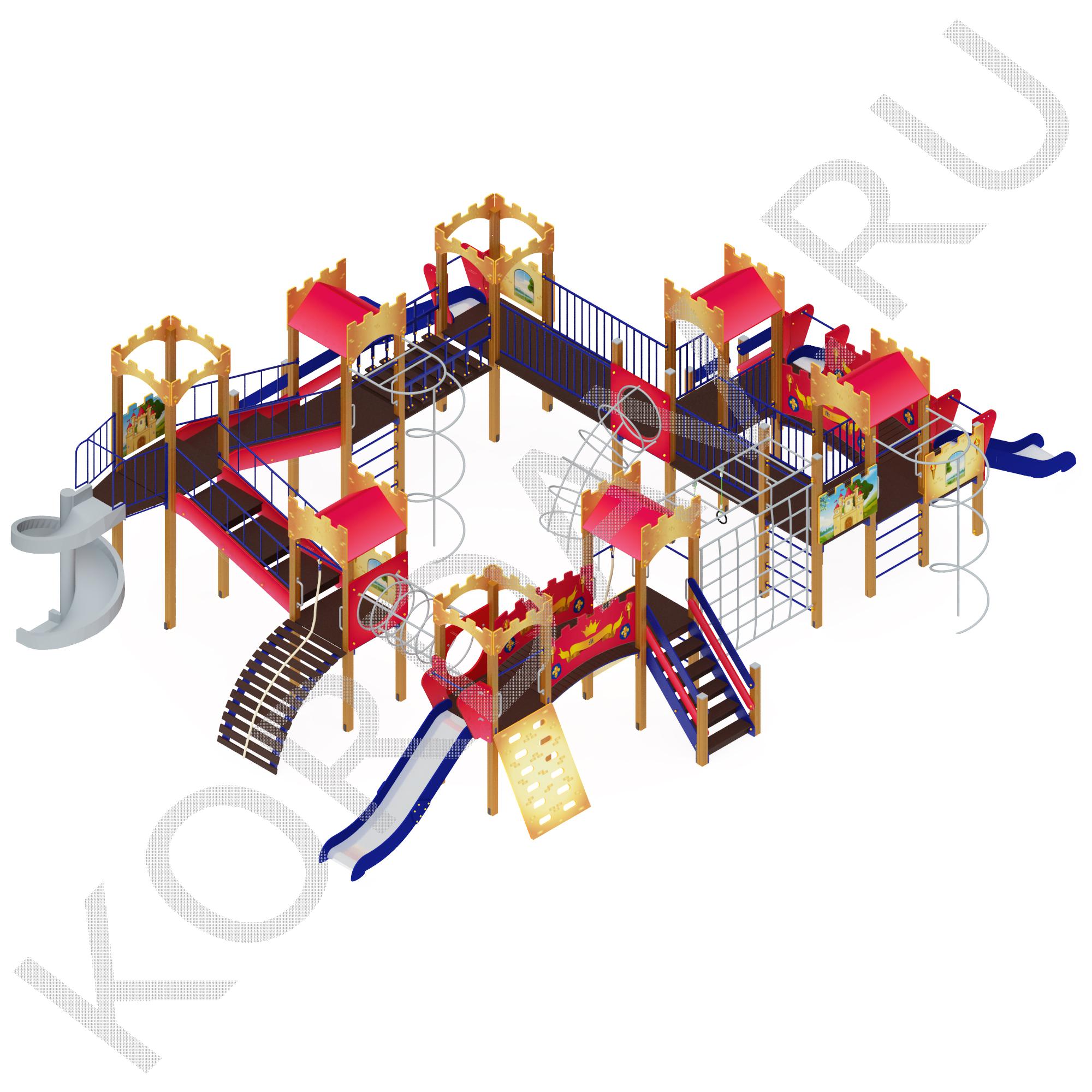 Большой комплекс для детских игр включает в себя: 8 башен; 2 моста ровных, лаз из стальных труб, 3 скат-горки, 2 вертикальных спирали с шестом, лаз из колец, рукоход, подвесной мост, 2 моста наклонных со ступенями, горизонтальный лаз из колец, бум с канатом, 2 скалолаза, 3 лестницы с поручнями, винтовая скат-горка из пластика, дугообразный мост, шведские мини-стенки. Для безопасности детей на площадках башен и рядом с игровыми элементами установлены борта из фанеры и металлические ограждения. Для изготовления комплекса используют: листы нержавеющей стали; брусья клееные 100х100 мм; стальные полосы 40 х 4 мм; фанера ламинированная с нескользким слоем 24 мм; фанера влагостойкая 9, 18, 24 и 32 мм; трубы с круглым сечением 27 и 32 мм; канаты 28 мм; крепежные элементы и заглушки. Вся конструкция покрыта износостойкими красками: фанерные и деревянные детали окрашены полиуретановой краской, а на стальные нанесено 2 слоя порошковой краской.